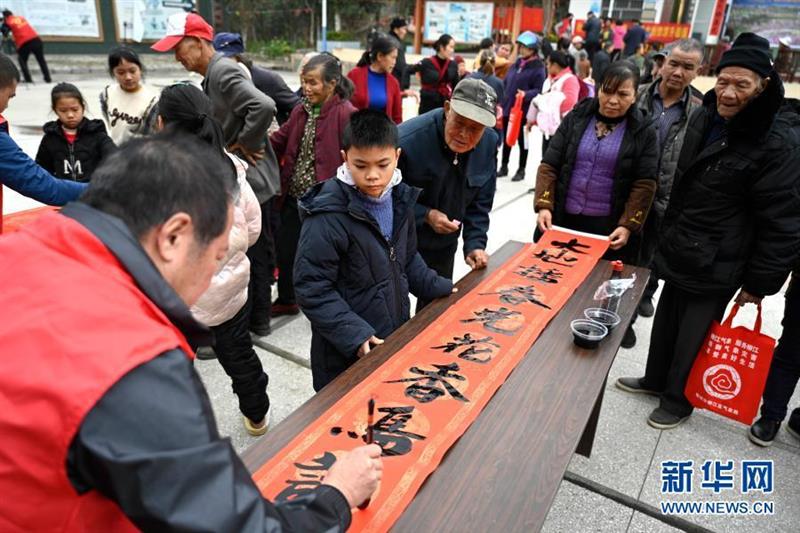12月27日,在广西柳州市柳江区进德镇龙新村,志愿者在村文化广场上给村民写春联。