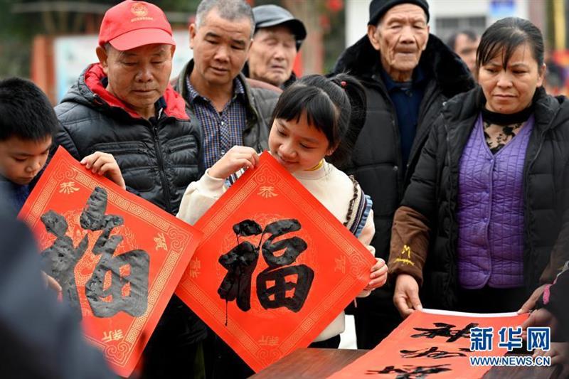 12月27日,在广西柳州市柳江区进德镇龙新村,村民拿到志愿者赠送的福字。