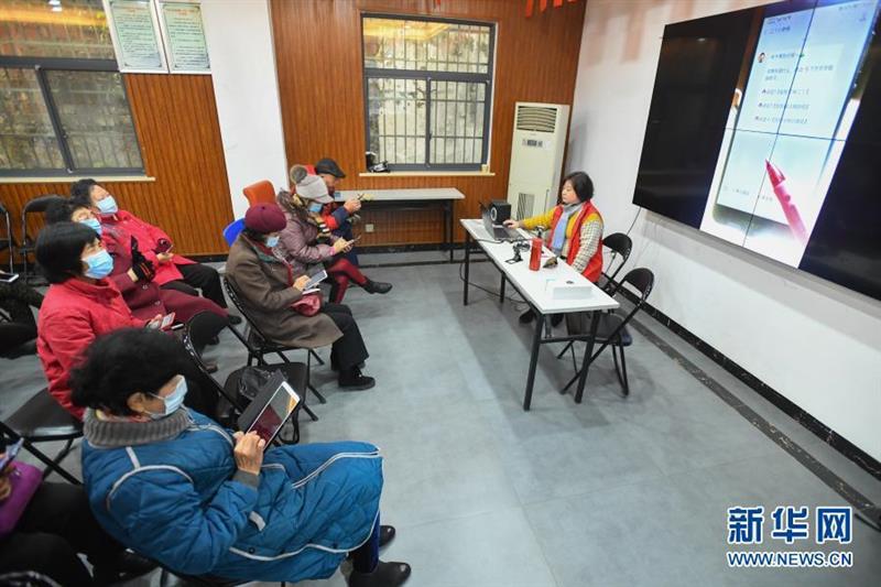 1月12日,在长沙市天心区金盆岭街道夏家冲社区,老年人在课上学习如何关注微信公众号。