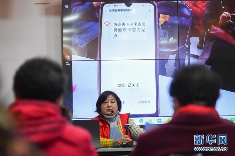 1月12日,在长沙市天心区金盆岭街道夏家冲社区,志愿者(中)为老年人讲解如何查看居民电子健康卡。