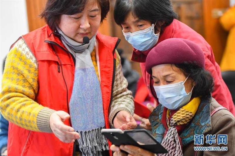 1月12日,在长沙市天心区金盆岭街道夏家冲社区,志愿者(左)教老年人使用智能手机。