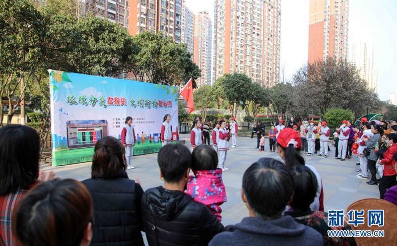 3月14日,学生们以诵读“垃圾分类歌谣”等形式宣传垃圾分类知识和方法。