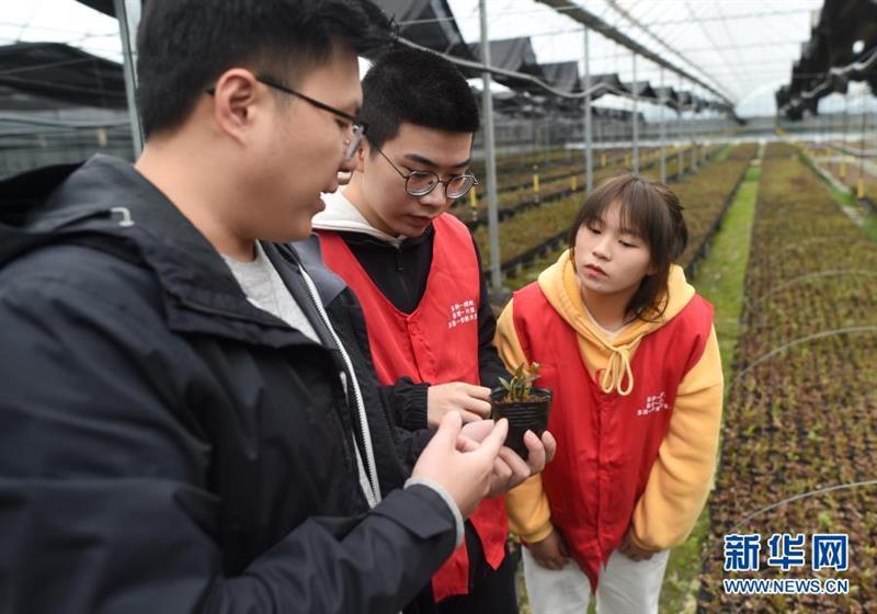 3月20日,志愿者吴科寰(中)在诸暨市次坞镇一个中药材种苗基地查看铁皮石斛长势。
