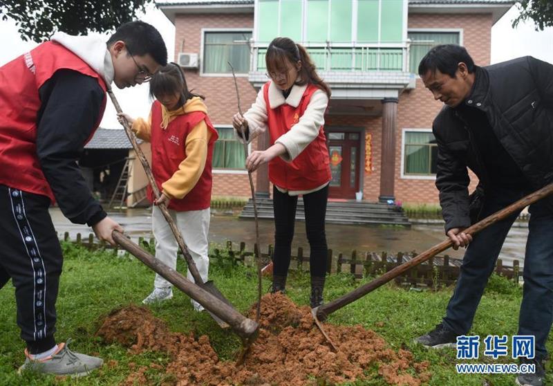 3月20日,志愿者吴科寰(左一)在诸暨市次坞镇吴高坞村农民吴正灿(右一)家庭院内栽下一棵无花果树。