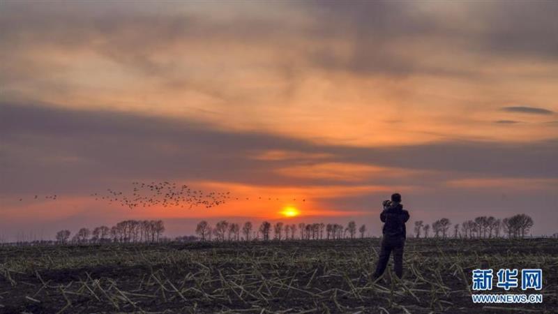 3月30日,在白城市镇赉县,护飞队长潘晟昱拍摄候鸟。