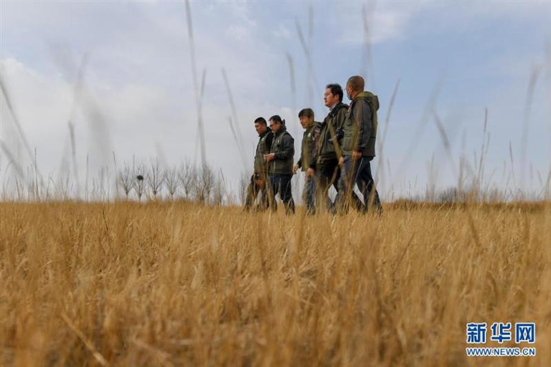 3月31日,在白城市镇赉县,护飞队员在野外观察候鸟活动情况。新华社记者 张楠 摄