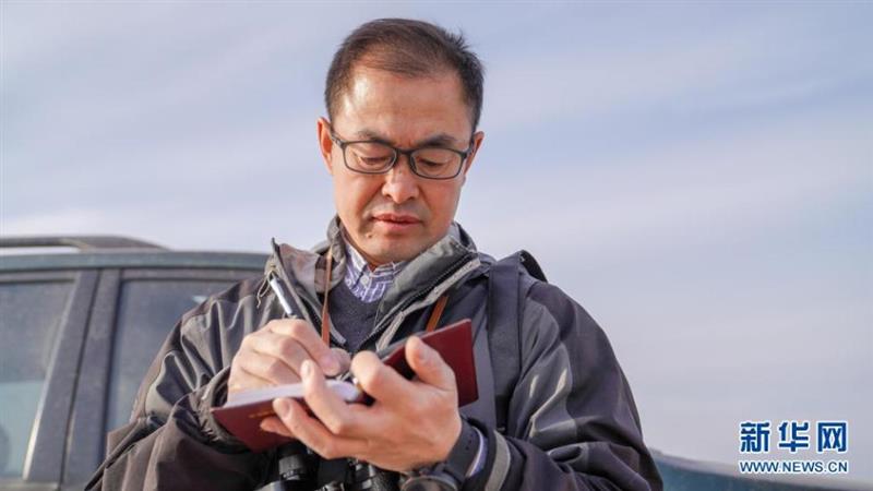 3月30日,在白城市镇赉县,护飞队长潘晟昱用笔记本记录候鸟信息。新华社记者 颜麟蕴 摄