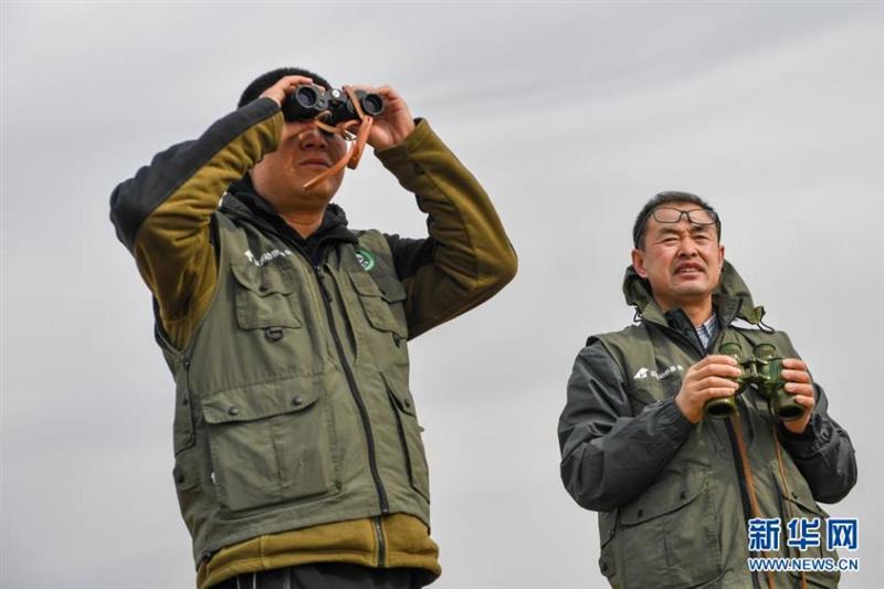 3月31日,在白城市镇赉县,护飞队长潘晟昱(右)和护飞队员王凯在野外观察候鸟活动情况。新华社记者 张楠 摄