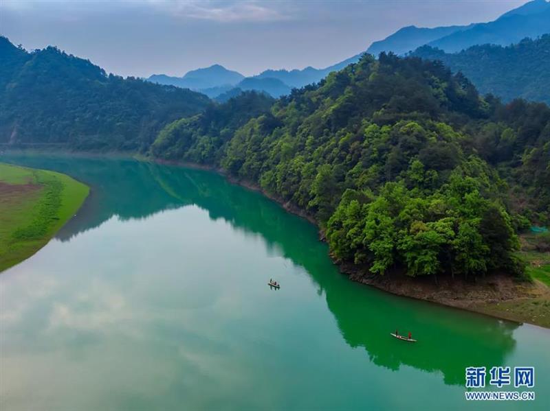 4月7日,浙江省淳安县临岐镇五庄村的“河小二”在湖面巡查,保持水体清洁(无人机照片)。新华社发(毛勇锋摄)