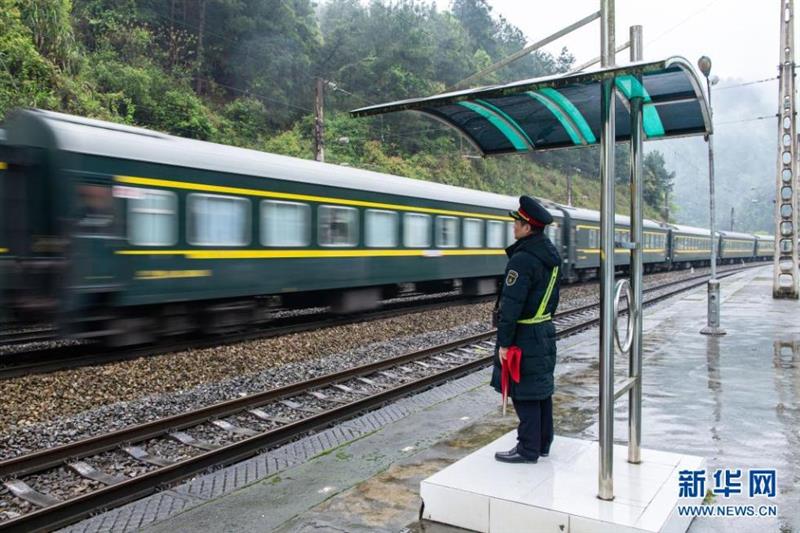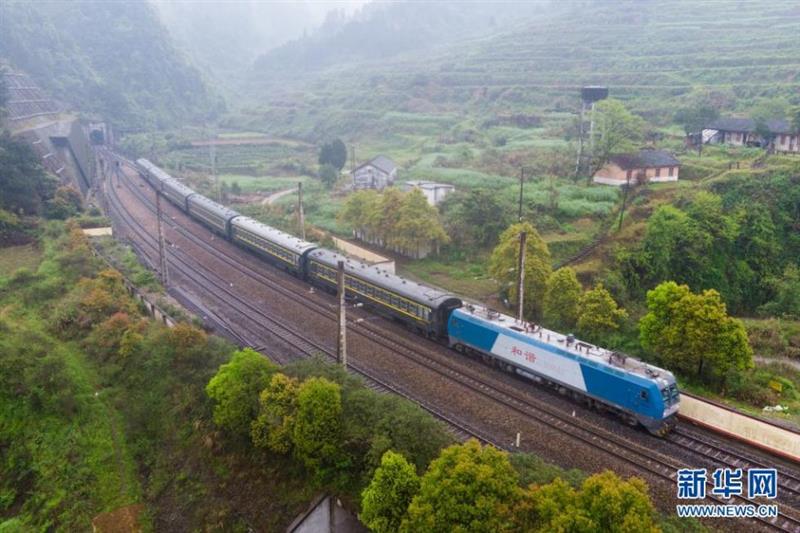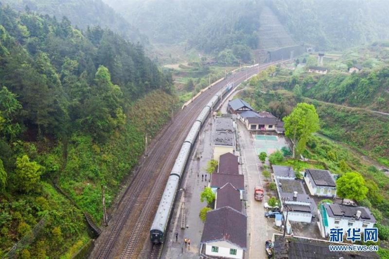 4月11日,一列列车经过湖南省湘西土家族苗族自治州古丈县默戎镇境内的万岩站。新华社记者 陈思汗 摄