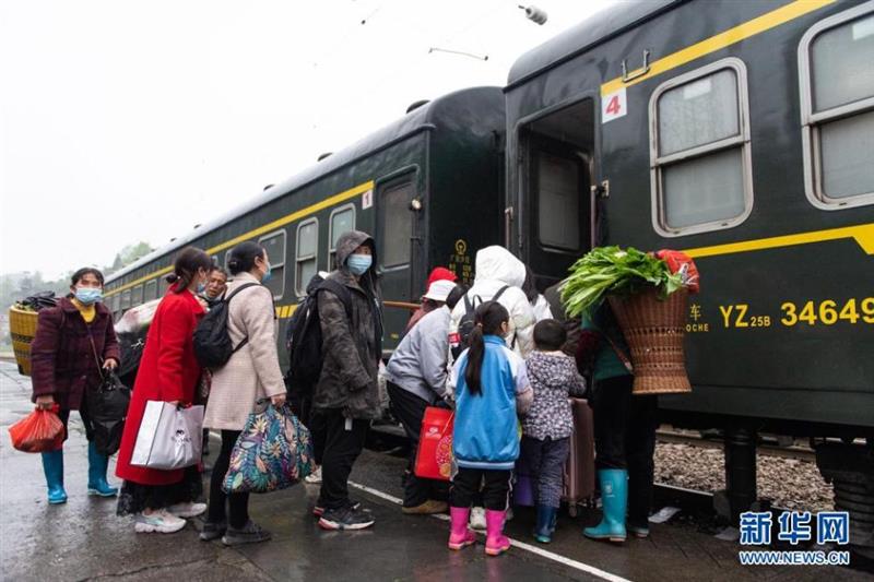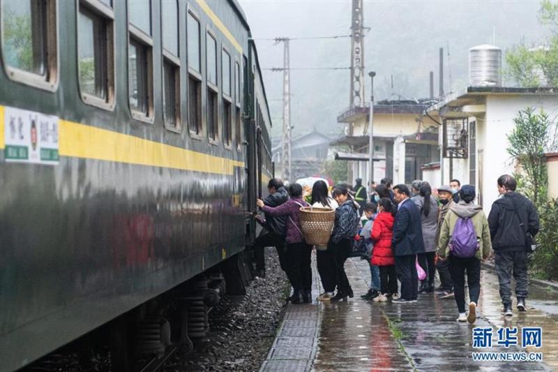 4月11日,乘坐7266次列车的乘客在大龙村站上车。新华社记者 陈思汗 摄