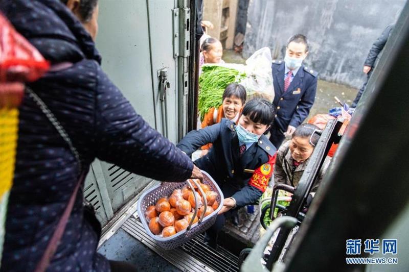 4月11日,乘务员在谷达坡站传递蔬菜,协助乘坐7266次列车的乘客上车。新华社记者 陈思汗 摄