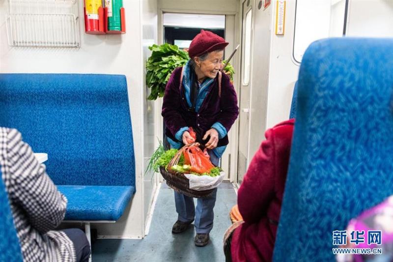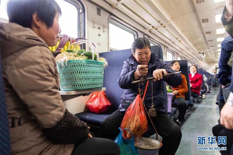 4月11日,一名乘客在7266次列车上出售蔬菜。新华社记者 陈思汗 摄
