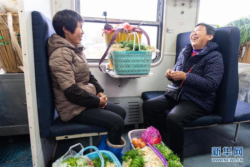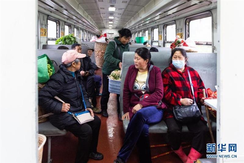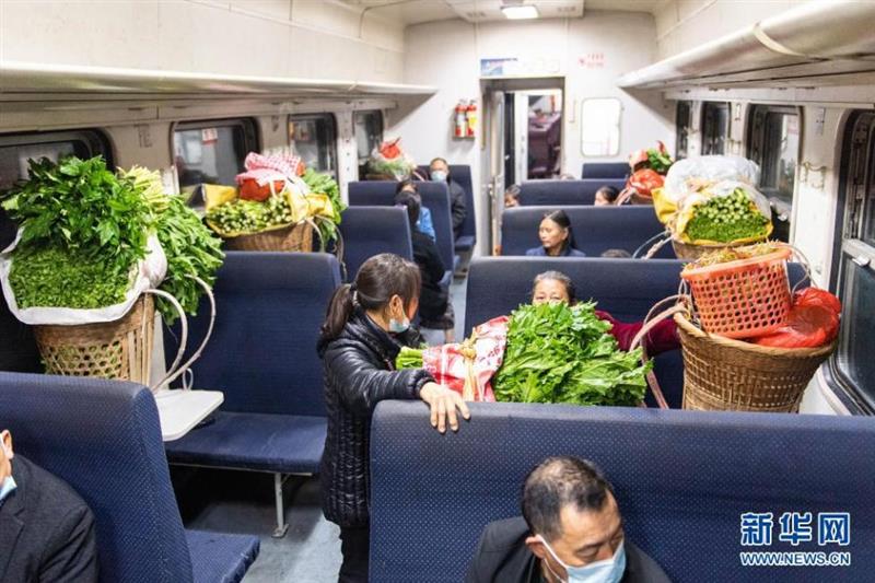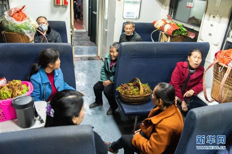 4月11日,已将蔬菜全部售出的乘客在7265次列车上围着空背篓聊天。新华社记者 陈思汗 摄
