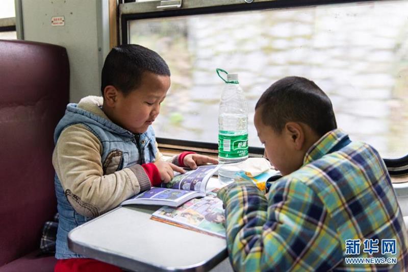 4月11日,两名儿童在7266次列车上看书。新华社记者 陈思汗 摄