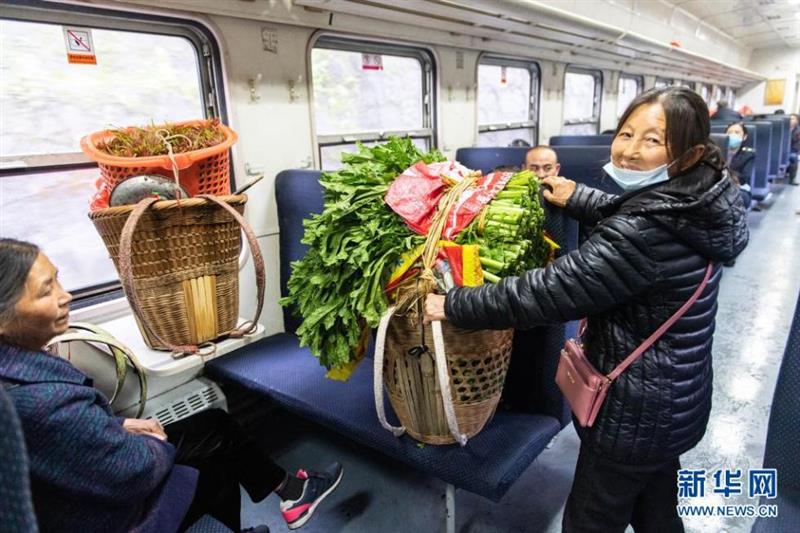 4月11日,乘坐7265次列车的乘客背着售空的蔬菜筐在吉首站上车回家。新华社记者 陈思汗 摄