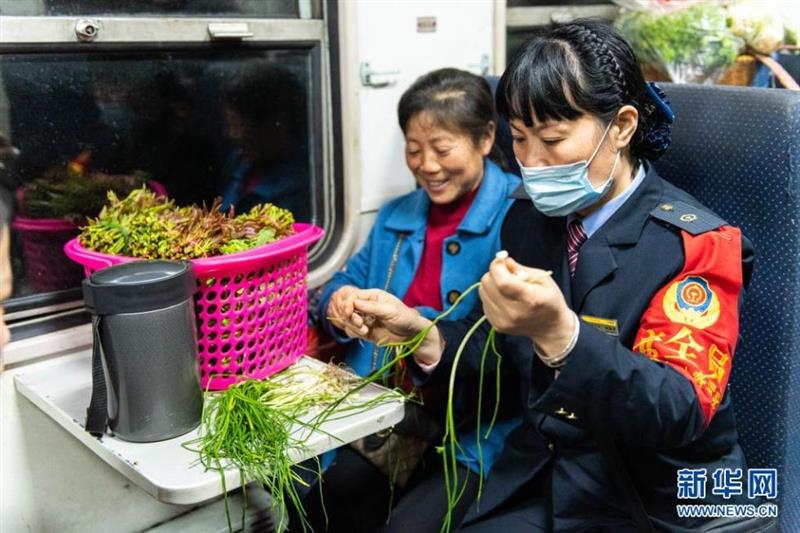 4月11日,乘务员在7266次列车上帮助乘客处理刚采摘的香葱。新华社记者 陈思汗 摄