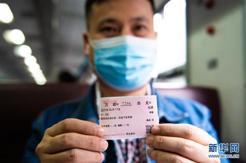 4月11日,乘坐7266次列车的乘客展示“万岩站-古丈站”的一元火车票。新华社记者 陈思汗 摄