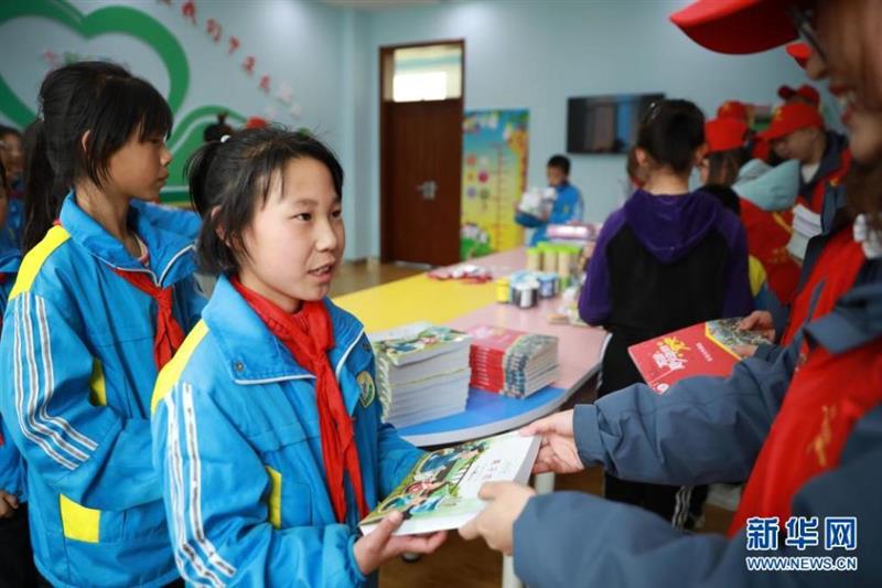 4月22日,在兰州新区第二小学,中建三局的志愿者给孩子们赠书。
