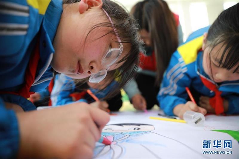 4月22日,在兰州新区第二小学,孩子们和中建三局的志愿者一起画画。