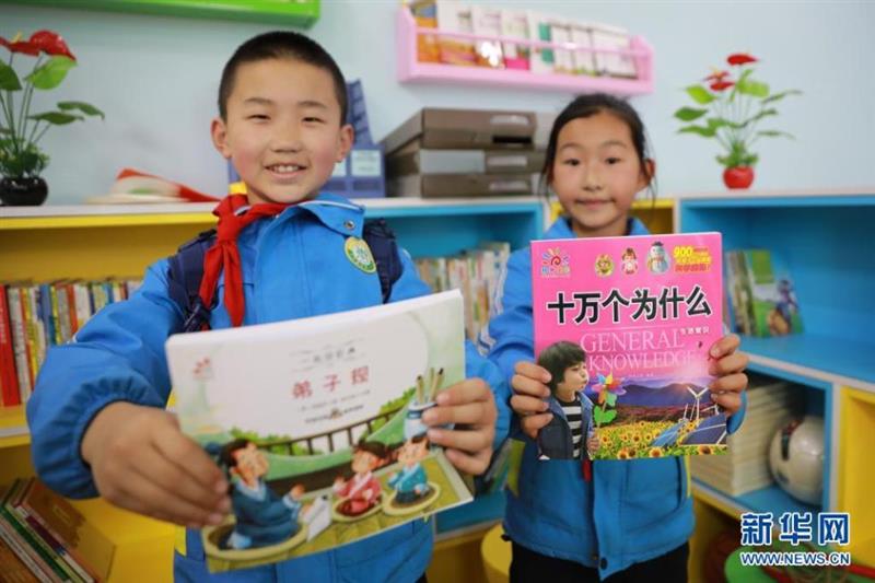 4月22日,在兰州新区第二小学,孩子们展示收到的新书。