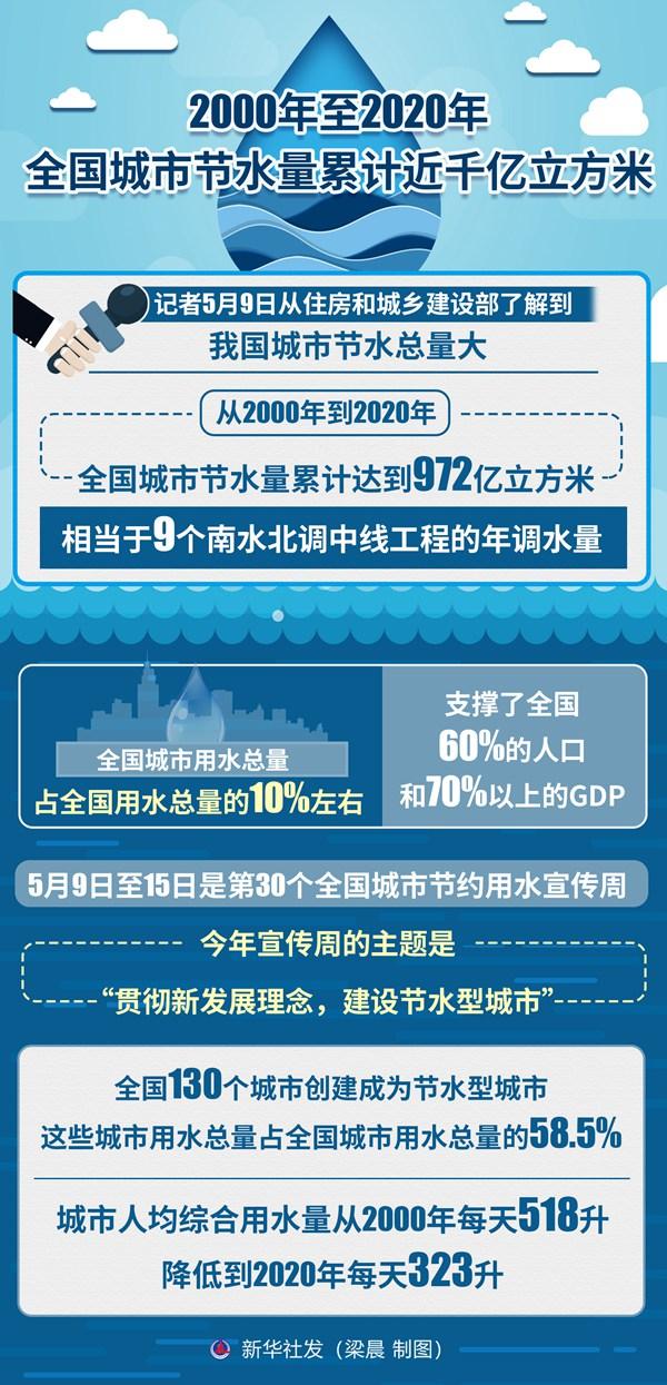 新华社北京5月9日电(记者王优玲)记者9日从住房和城乡建设部了解到,我国城市节水总量大,从2000年到2020年,全国城市节水量累计达到972亿立方米,相当于9个南水北调中线工程的年调水量。