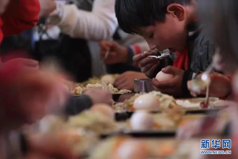 图为鹤峰县中营镇民族中心学校的学生在吃免费午餐。2012年起,鹤峰县将国家营养改善计划和免费午餐项目进行整合升级,形成“国家+政府+基金会”模式。免费午餐已发展成免费早餐和午餐,餐费标准也由最初的每人每餐3元,到今年秋季开学将进一步提升至6元。
