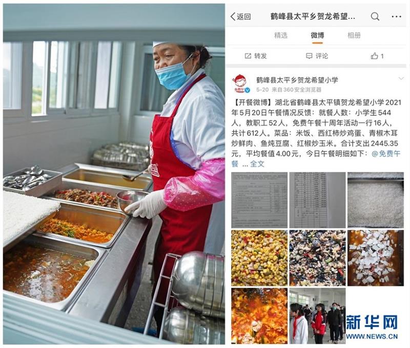 图为鹤峰县太平镇贺龙希望小学的餐厅员工正在备餐(左);学校微博公示当日菜品及就餐情况(右)。十年来,鹤峰县不断规范免费午餐的运营管理,教育、工商、食药监等职能部门定期或不定期进行食堂安全卫生检查,监督饭菜质量。县内所有免费午餐学校均坚持每个开餐日公示孩子们的伙食、采购信息及就餐情况等。新华网 吴文华摄