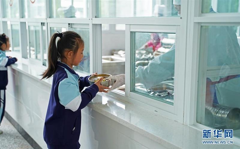 图为鹤峰县太平镇贺龙希望小学的学生们排队进入食堂领取免费午餐。新华网 吴文华摄