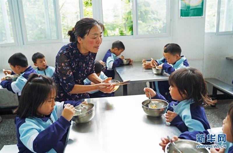 图为鹤峰县太平镇贺龙希望小学的老师杨双岚和学生一起就餐。新华网 吴文华摄