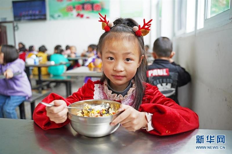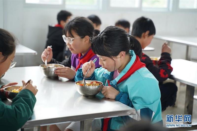 图为鹤峰县太平镇贺龙希望小学五年级学生向媛(右一)正在吃免费午餐。她说,学校菜品丰富、荤素搭配。除了免费的早、午餐,平时还可享受学校免费住宿,减轻了家里的负担。新华网 吴文华摄