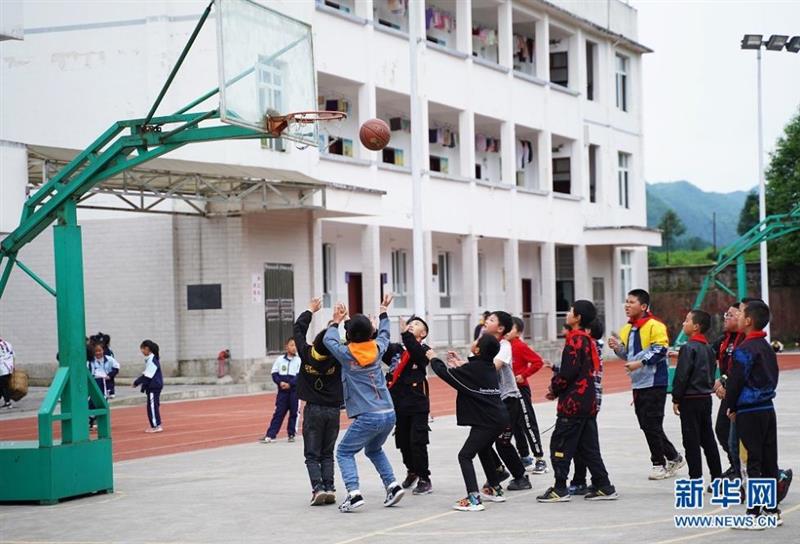图为午餐后,鹤峰县太平镇贺龙希望小学的学生们在操场打篮球。新华网 吴文华摄
