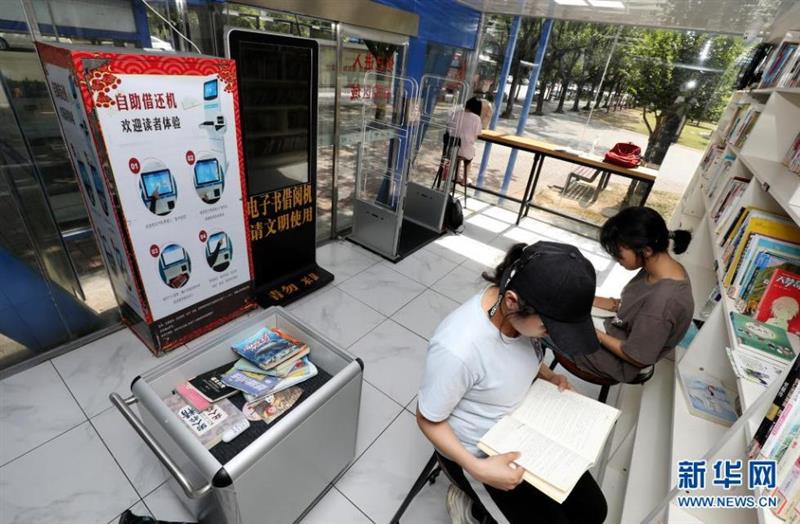 7月12日,读者在湖南省资兴市人民广场24小时自助图书馆读书。