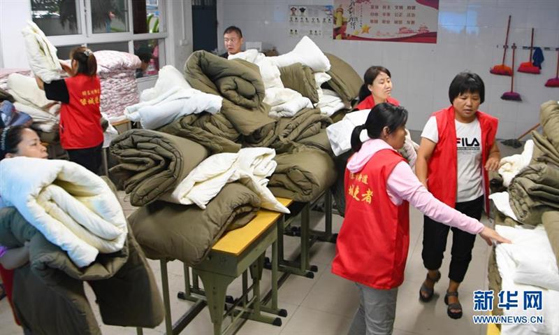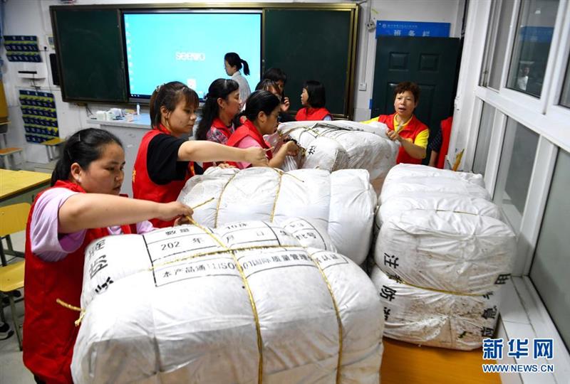 7月21日,在郑州市电子信息工程学校集中安置点,志愿者在整理被褥。