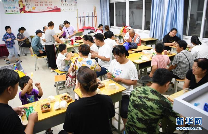 7月21日,转移群众在郑州市电子信息工程学校集中安置点吃晚饭。