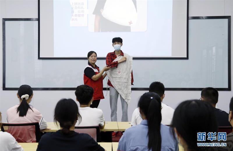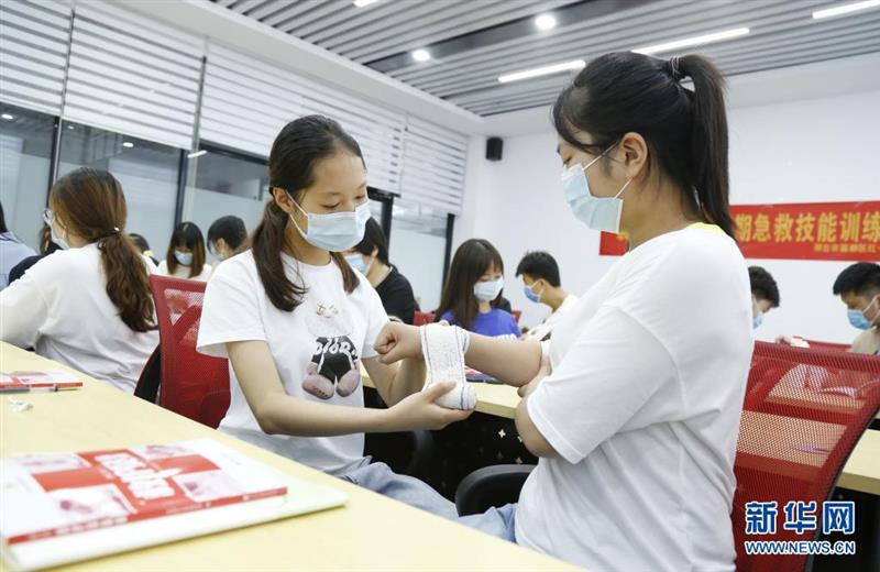 7月29日,大学生在邢台市襄都区学习创伤包扎。近年来,河北省邢台市襄都区红十字会面向社区群众、学校师生、企业员工等群体开展心肺复苏、创伤止血包扎等自救、互救课程,增强群众的应急处置能力。截至目前,已开展培训40场,覆盖约3000人次。新华社发(张驰 摄)