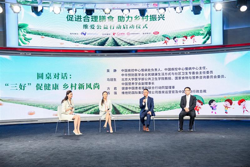 圆桌论坛环节,中国疾控中心慢病处负责人、中国疾控中心慢病中心主任吴静,北京大学医学部公共卫生学院教授、国家食物与营养咨询委员会委员马冠生,健康中国患者援助联合行动同盟理事方君,维他奶国际集团有限公司首席运营官及中国内地行政总裁苏强共同围绕“营养促健康 乡村新风尚”展开交流分享,助力营养健康事业与乡村振兴的有效衔接,推动形成健康生活乡村新风尚。