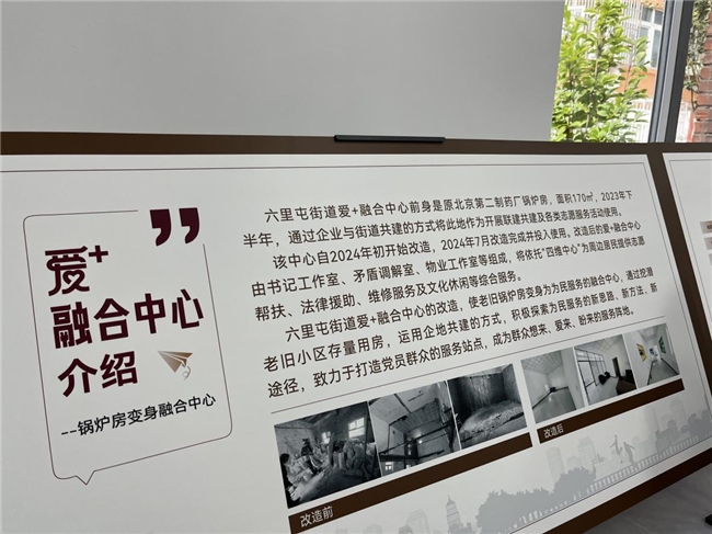 其实,六里屯街道“爱+”融合中心也是老旧小区改造的典范,其前身是原北京第二制药厂锅炉房,面积170平方米,2023年下半年,通过企业与街道共建的方式将此地作为开展联建共建及各类志愿服务活动,并于2024年7月改造完成并投入使用。改造后的爱+融合中心周边居民提供志愿帮扶、法律援助、维修服务及文化休闲等综合服务。