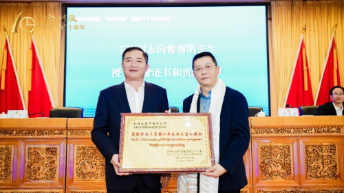 西藏自治区政协副主席王刚向曾智明授予荣誉证书和纪念牌匾
