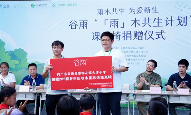 新学期伊始,谷雨携手禾希有物公司、上海远方书声公益组织在韶关梅花镇大坪小学举办了环保课桌椅捐赠仪式,捐赠的205套环保课桌椅均由谷雨品牌空瓶回收再造而成,具备安全耐用性,同时也体现出品牌对环境保护和设计美学的坚持,不仅改善了孩子们的学习条件,还为学校环境注入全新活力。