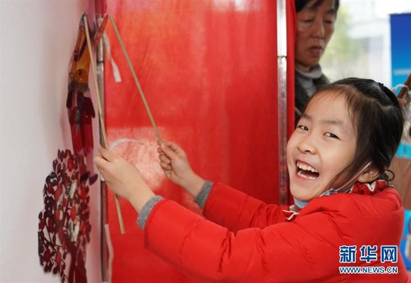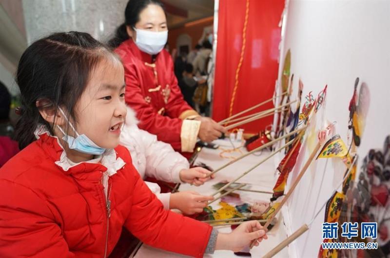 1月30日,一名女孩在学习表演皮影戏。新华社记者 任珑 摄