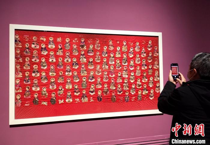 参观者欣赏《拼布绣百佛图挂帐》。 邓霞 摄