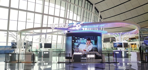 中国移动5G旅客互动体验区位于北京大兴国际机场二层国内混流区内,利用5G低时延、高速率、大带宽的优势特性,结合XR、MR等增强现实技术以及BOE画屏、8K超高清视频等高品质展示手段,为国内外旅客展示5G智慧机器人、5G机械臂、5G云游戏等各类5G应用场景。