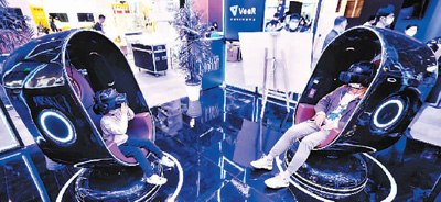 人们在江西南昌绿地国际博览中心体验VR观影。
