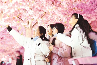春节临近,江苏南京新街口一大型购物中心在商场前布置了近20棵人工制作的桃树,粉色“花海”引来不少年轻人前往“打卡”。 |