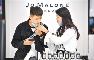 自2020年7月1日免税新政实施至12月31日,海南离岛免税店日均销售额超1.2亿元,同比增长2倍多。图为消费者在海口日月广场免税店选购香水。 |