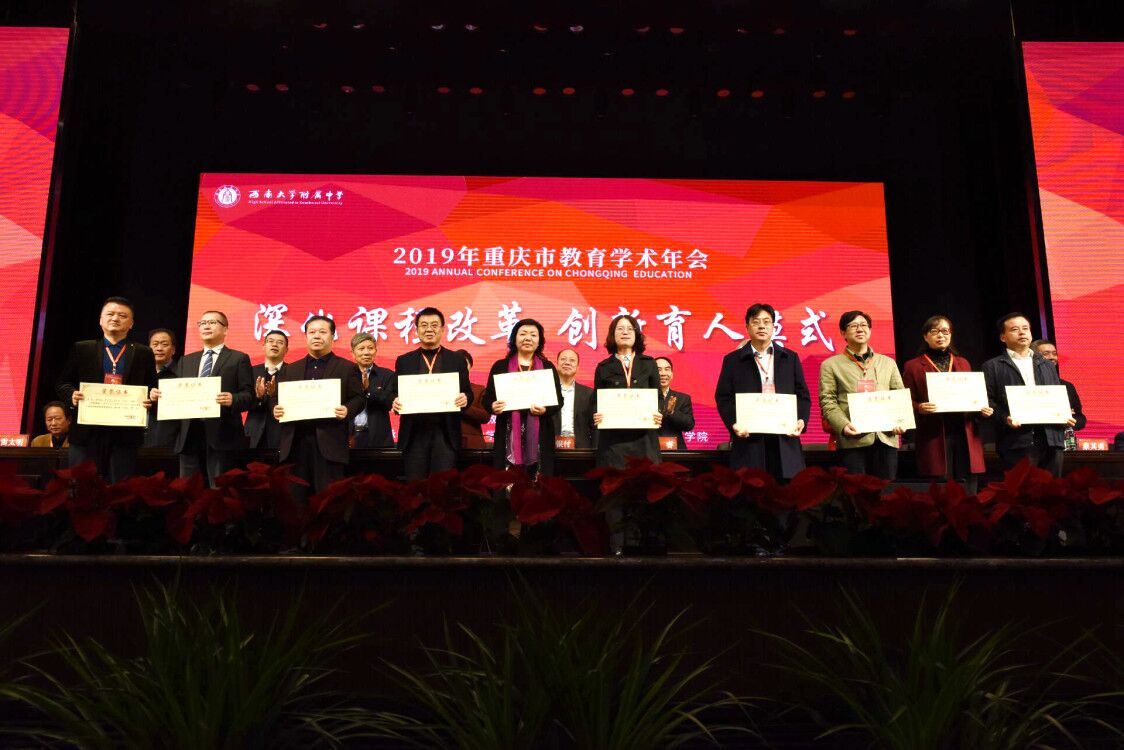 重庆市教育学会副会长、四川外国语大学党委书记邹渝宣读重庆市第七届优秀基础教育著述评选获奖名单、第四届中小学教师优秀教育教学论文奖获奖名单、重庆市教育学会科研先进集体获奖名单。