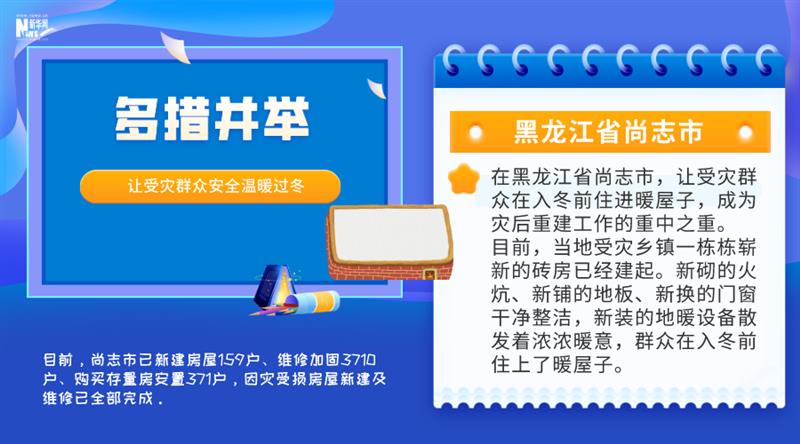 在黑龙江省尚志市,让受灾群众在入冬前住进暖屋子,成为灾后重建工作的重中之重。目前,当地受灾乡镇一栋栋崭新的砖房已经建起。新砌的火炕、新铺的地板、新换的门窗干净整洁,新装的地暖设备散发着浓浓暖意,群众在入冬前住上了暖屋子。