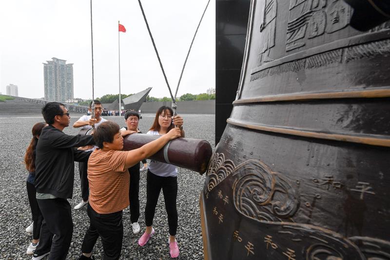 2019年9月3日,人们在侵华日军南京大屠杀遇难同胞纪念馆撞响和平大钟。 新华社记者李博 摄