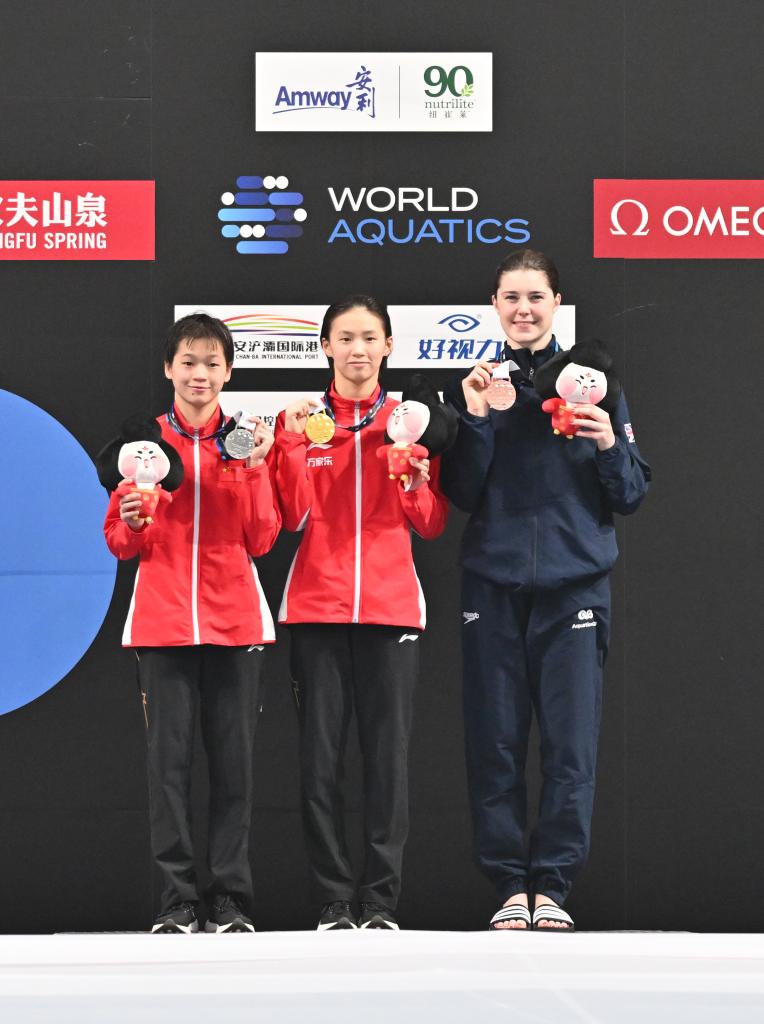 4月21日,陈芋汐(中)、全红婵(左)与西里埃在颁奖仪式上。新华社记者 张博文 摄